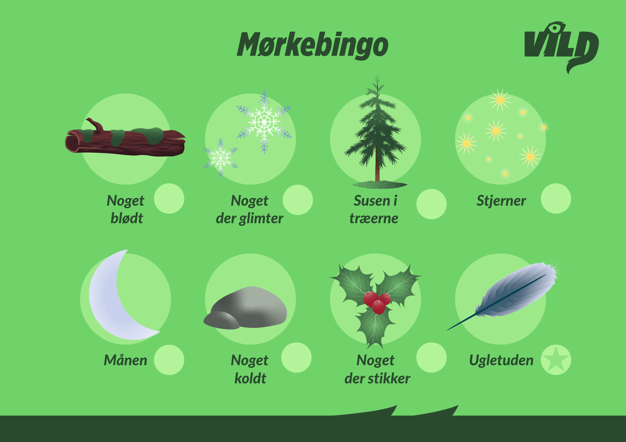 Stikkende nåletræ, glitrende iskrystaller, en fjer, en kold sten eller et skrig fra en ræv. Eller download vores vilde “Mørkebingo” her.